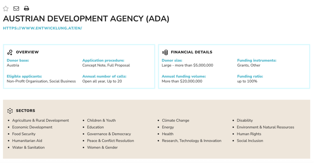We feature over 2,300 foundations, 230 government funders, 500 funds, 40 UN agencies and 180 impact investors. Moreover, it provides you with live and recorded webinars (i.e. How to access funds from foundations) as well as resource guides (i.e. Donor Mapping for Uganda). It is suitable for non-profit organisations and businesses of any size which are in need of funding from public (i.e. EC, AFD, UN, AusAid, etc.) and private (i.e. foundations, NGOs etc.) donors.